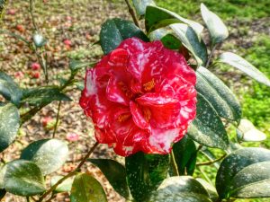 Enormous Live Oaks and alligators are found all along the roadway that leads us on a self-guided tour. We stopped to admire one large oak, bordered by a brilliant line of azaleas. I have shared a picture here, but this is a tiny sampling of them. The camellias were also on full display, with the shrubs filled with blooms.